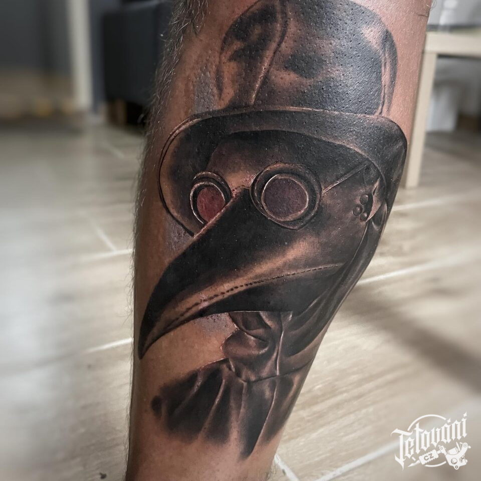 Tetování maska, morový doktor na lýtko
