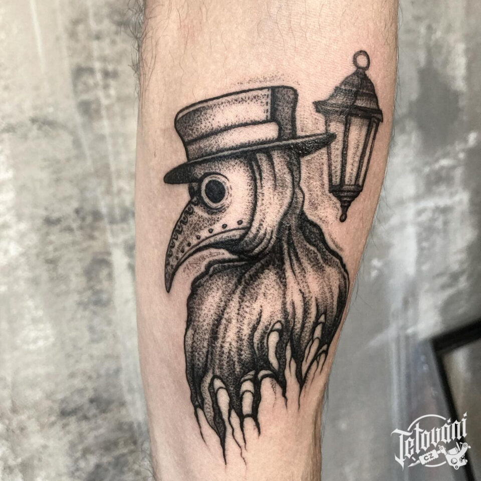 Tetování maska, morový doktor na lýtku