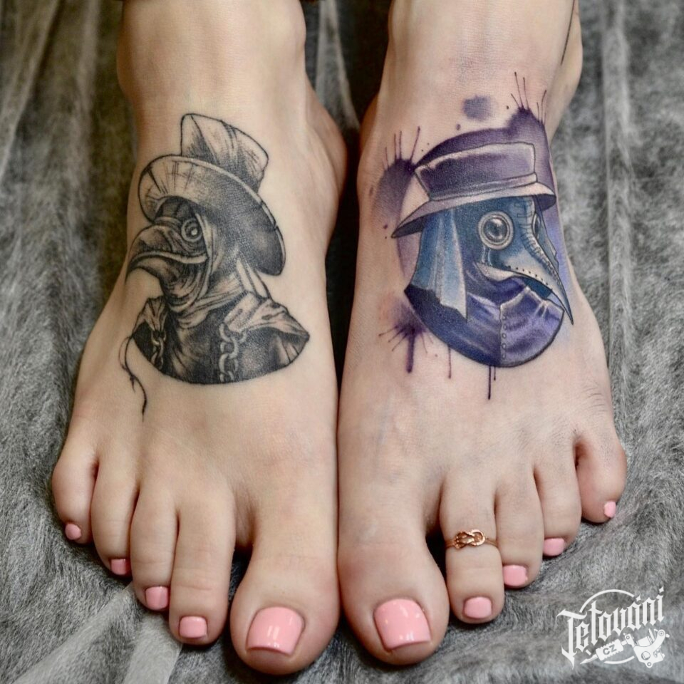 Tetování maska, morový doktor na nártu