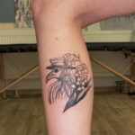 Tetování maska, morový doktor s květinami na lýtku
