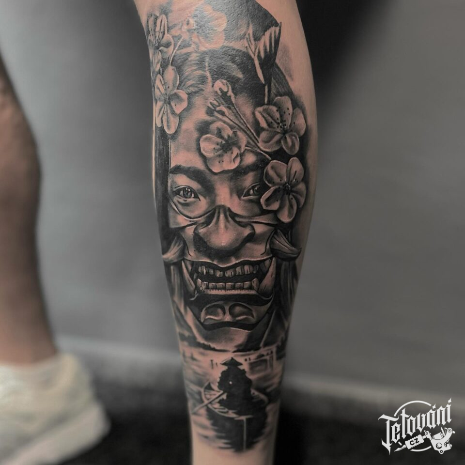Tetování maska, portrét samuraje na holeni