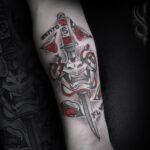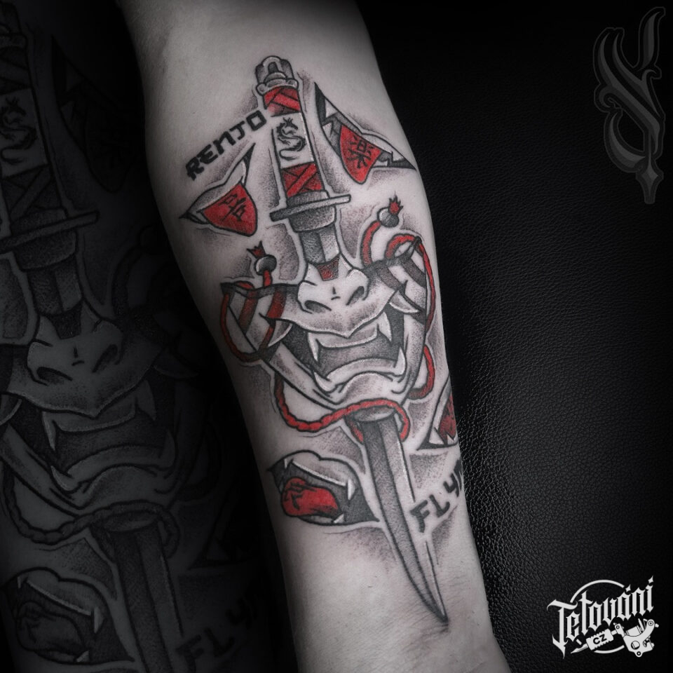 Tetování maska s mečem na předloktí