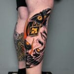 Tetování maska s ptákem a symbolem na lýtko
