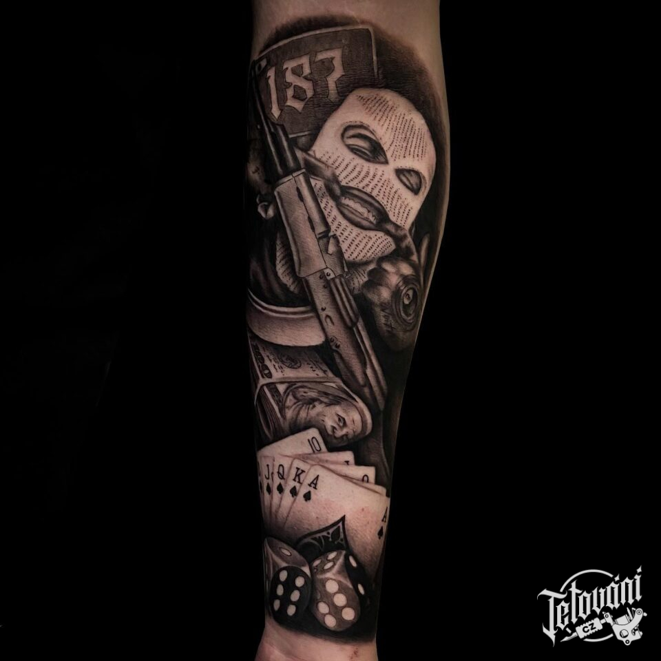 Tetování masky, hrací kostky a karty na předloktí