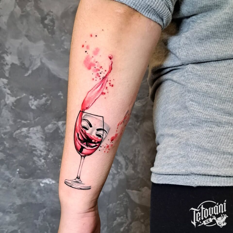Tetování masky, sklenička vína na předloktí