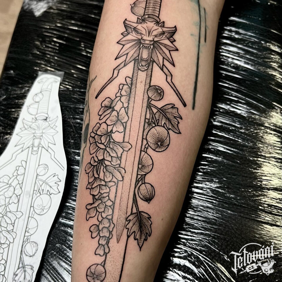 Tetování meč a květiny na lýtko