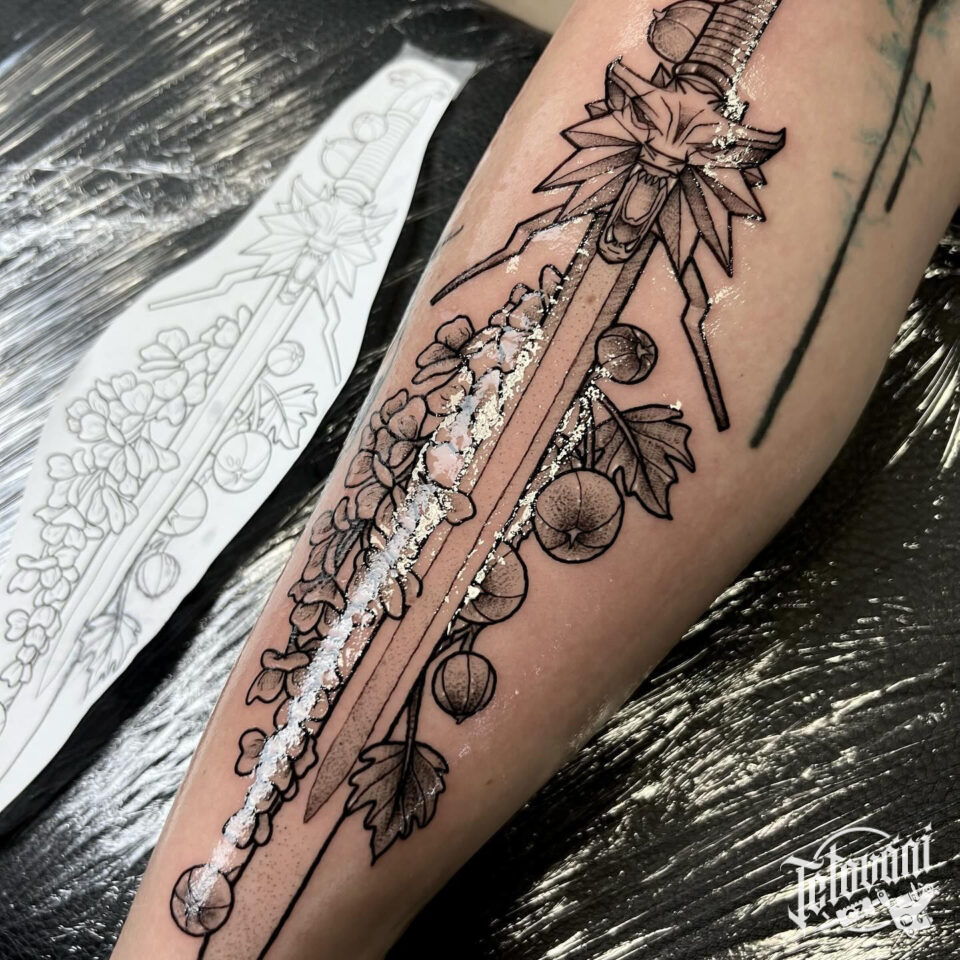 Tetování meč a květiny na lýtko