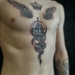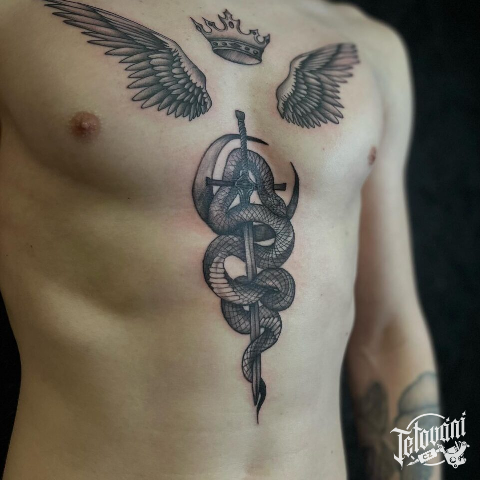 Tetování meč, had, zvíře, koruna, křídla na hrudník