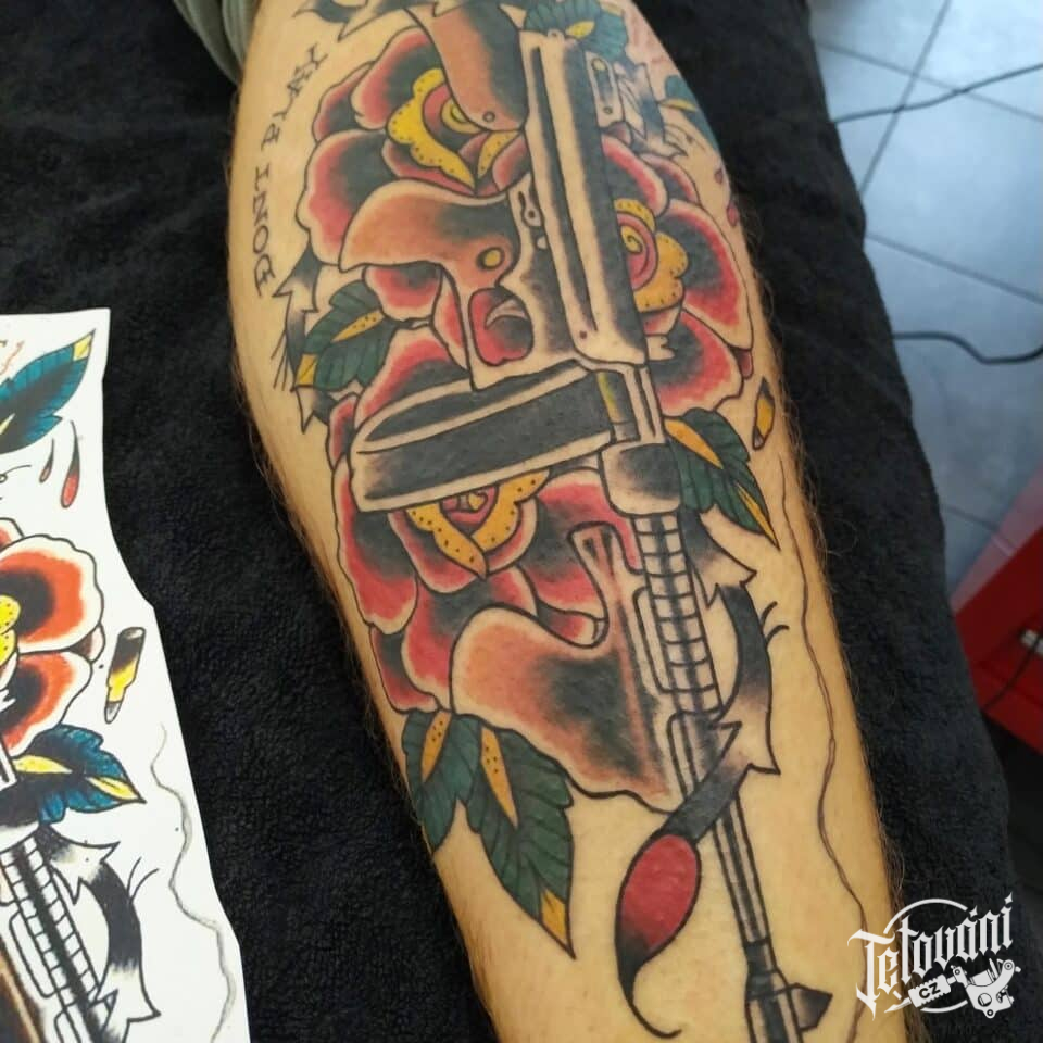 Tetování meč, květiny na lýtko