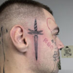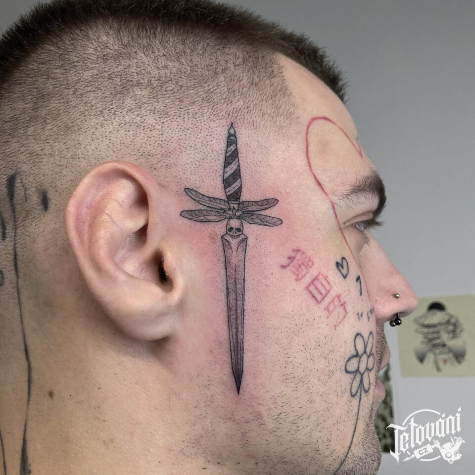 Tetování meč s lebkou na obličeji