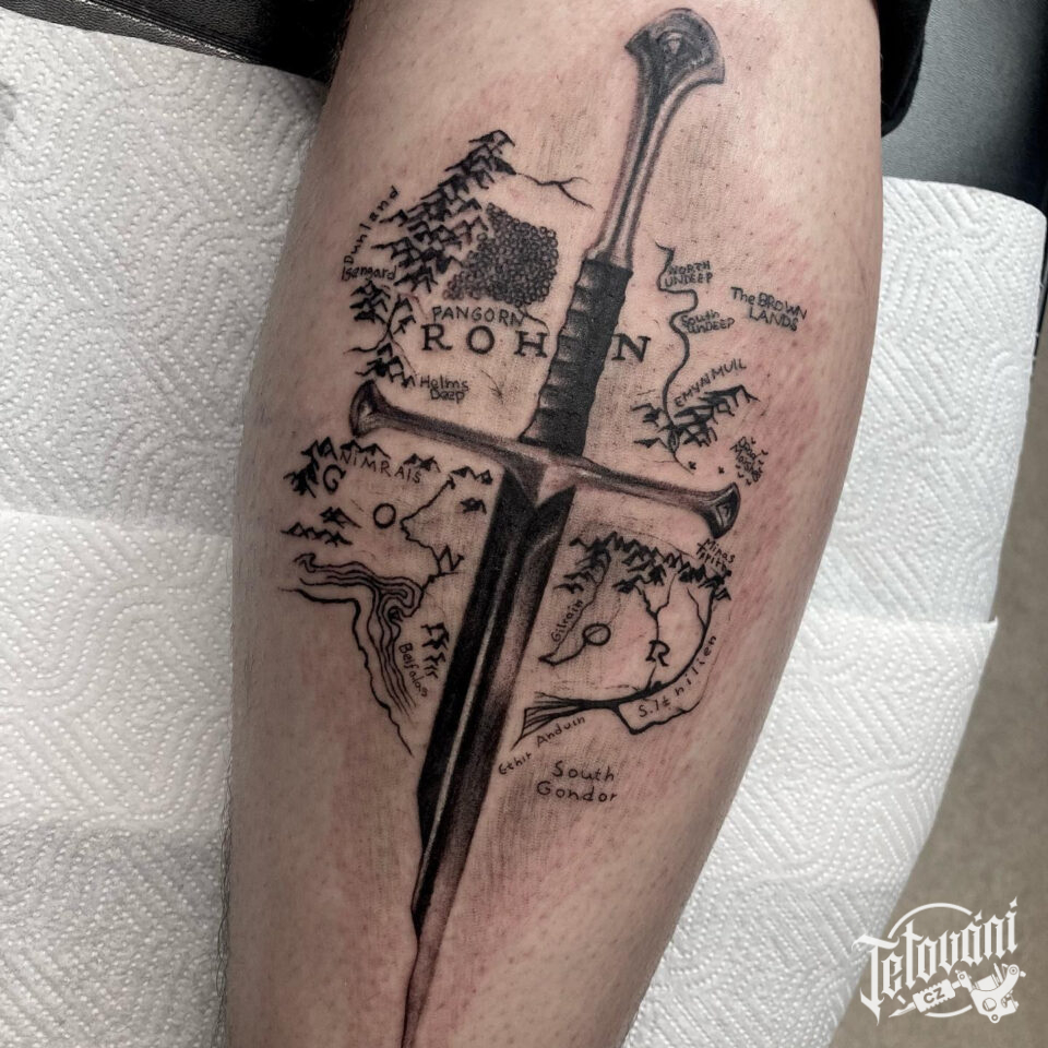 Tetování meč z filmů a pohádek Pán prstenů na lýtku