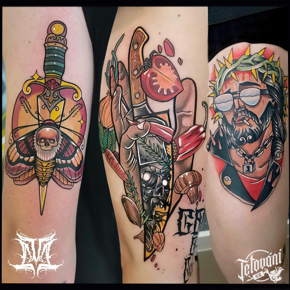 Tetování meč, zvíře smrtihlav, lebka, Ježíš Kristus na ruku a nohu