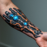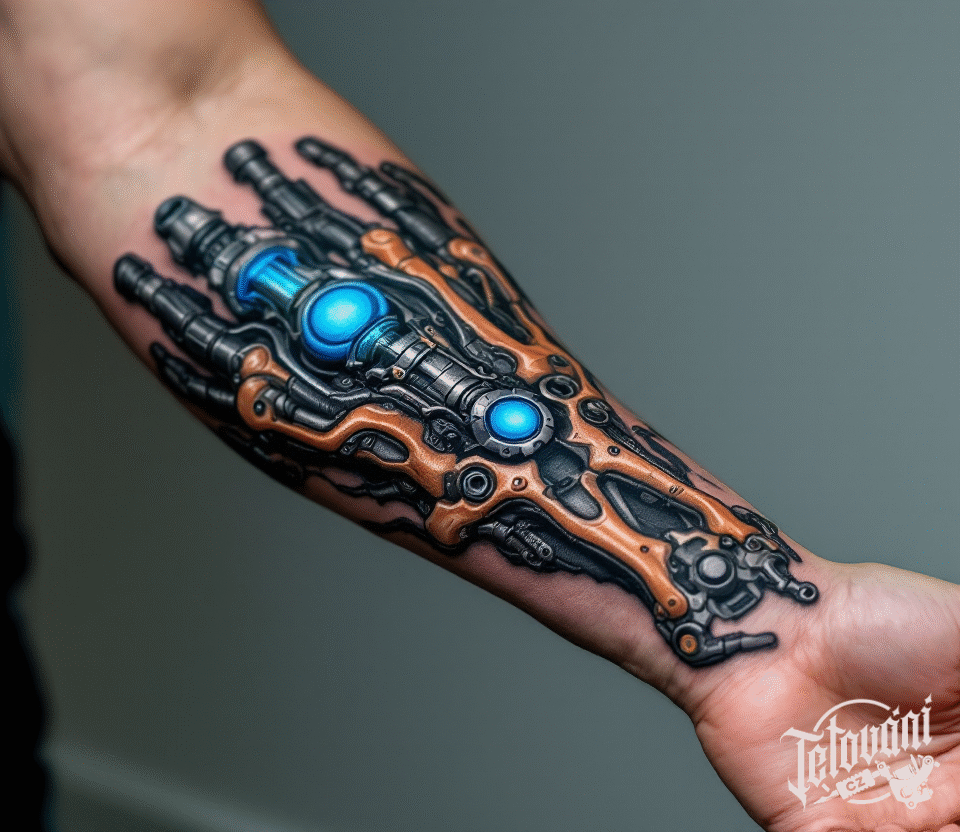 Tetování mechanika robotické ruky s modrými prvky na předloktí