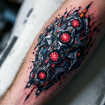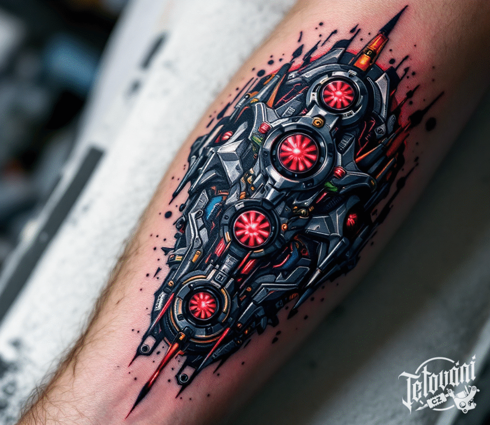 Tetování mechanismus robotické ruky s červenými čidly na předloktí