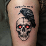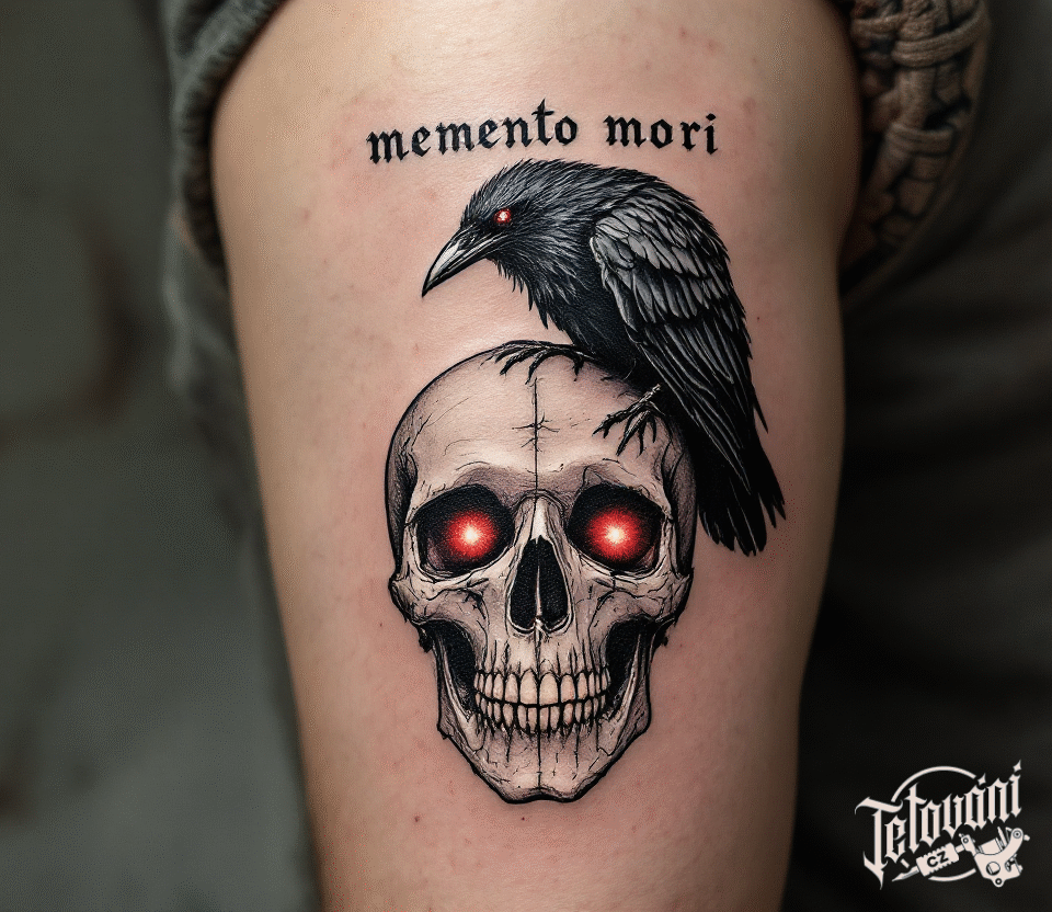 Tetování memento mori s lebkou a havranem na rameno