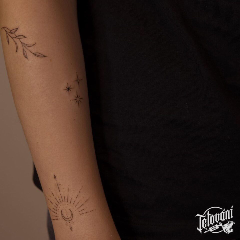 Tetování Měsíc, hvězdy, znaky a symboly na předloktí