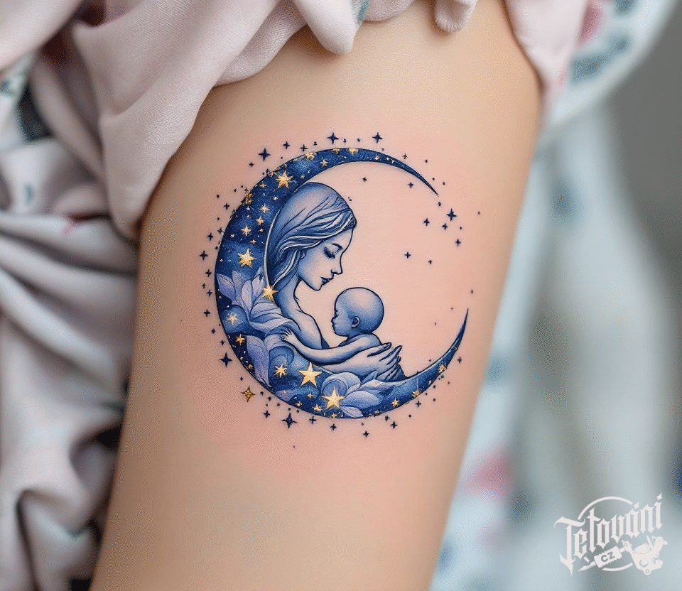 Tetování měsíc, matka s dítětem jako symbol mateřské lásky na rameno