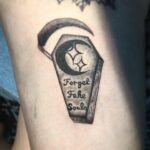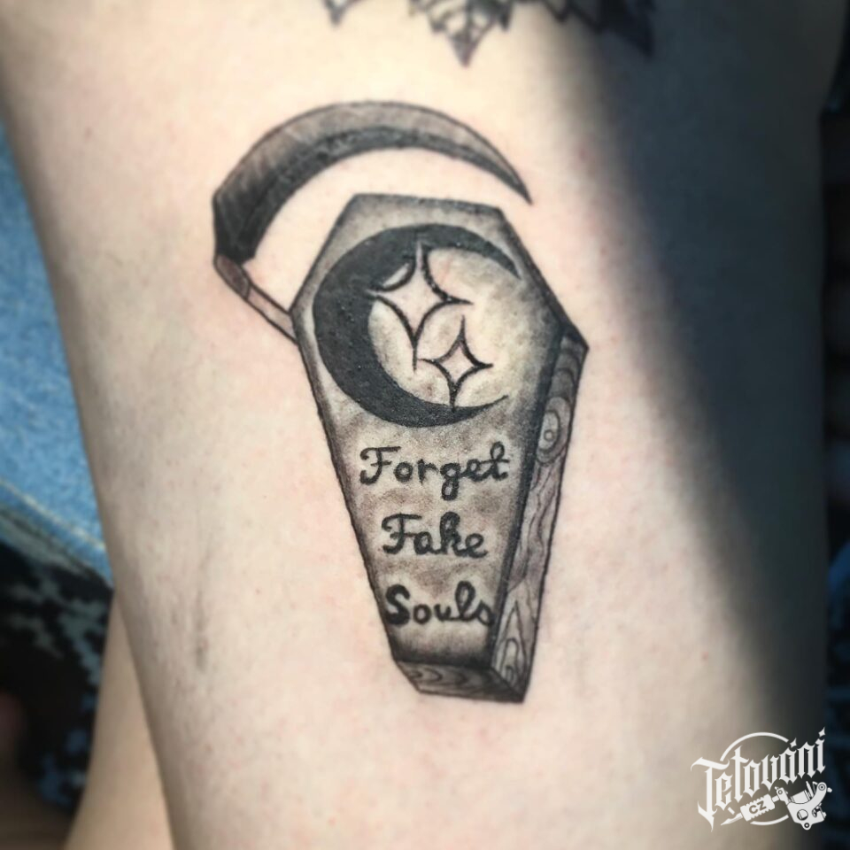 Tetování měsíc, nápis a znaky a symboly rakev a kosa na stehnu