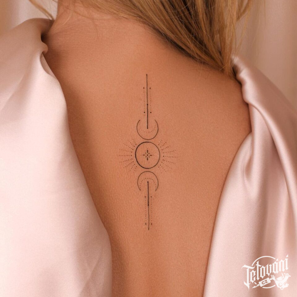 Tetování měsíc, slunce, čáry, symboly na páteř