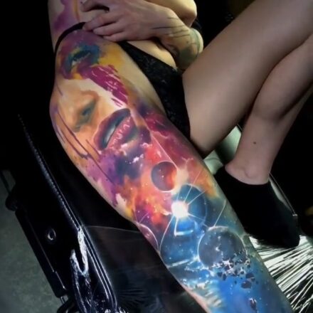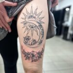 Tetování měsíc, slunce, květiny na stehno
