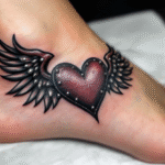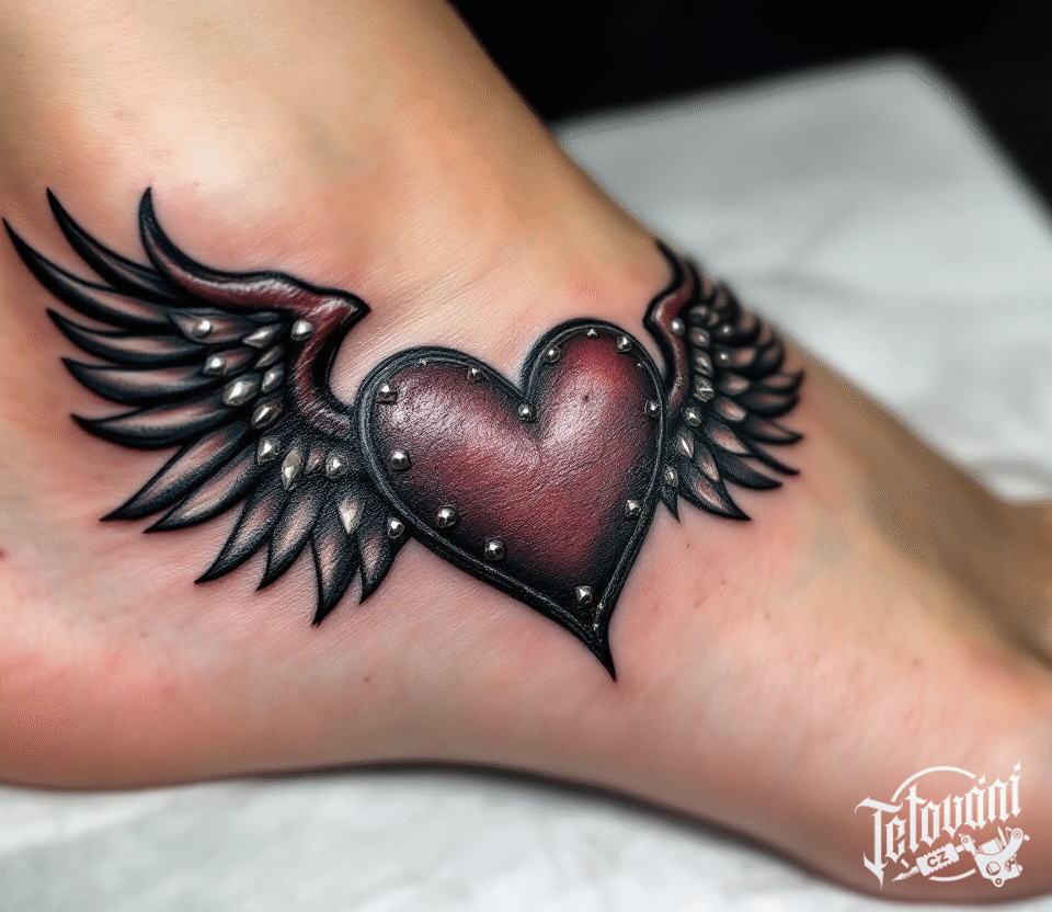 Tetování metalové srdce s křídly na nárt