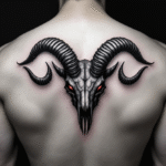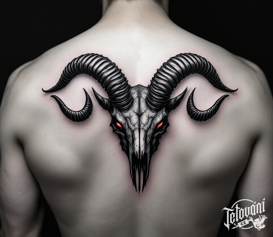 Tetování metalový motiv, lebka kozoroha na záda