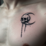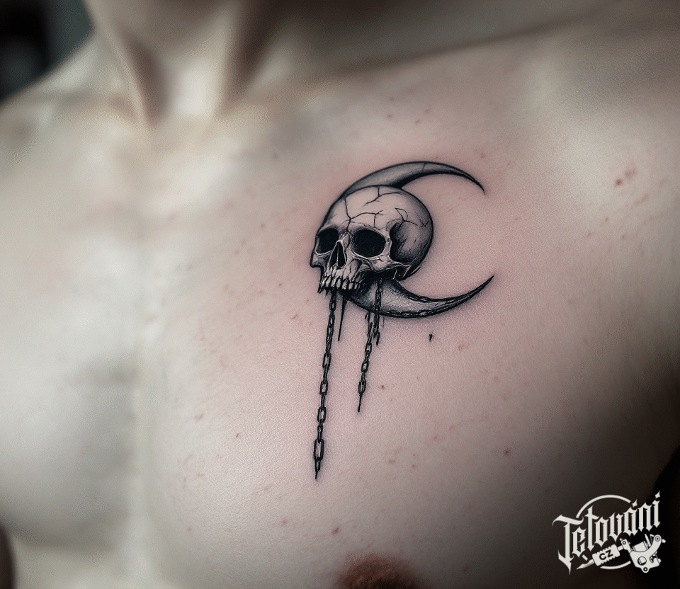 Tetování metalový motiv lebka s měsícem na prso