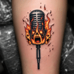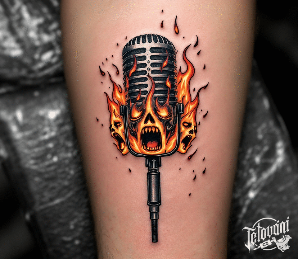 Tetování metalový motiv ohnivý mikrofon na lýtko
