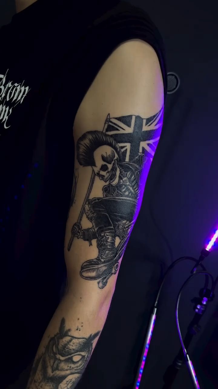 Tetování metalový motiv, předmět nůž s lebkou na rameno