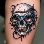 Tetování metalový motiv, robotická lebka na bok stehna