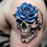 Tetování modrá růže a lebka na rameno
