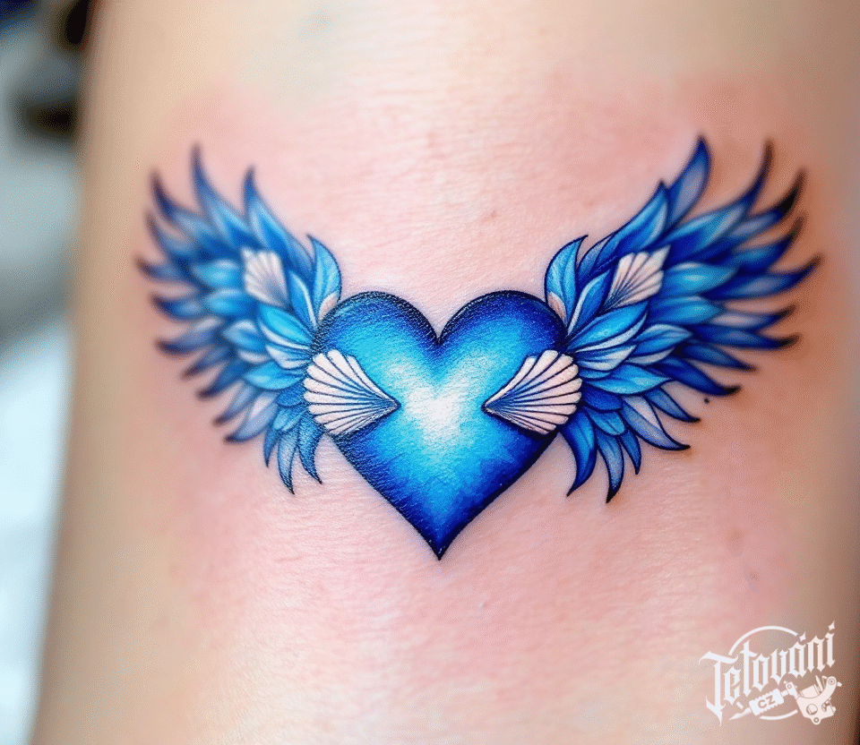 Tetování modré srdce s křídly na rameno