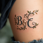 Tetování monogramy na boku stehna