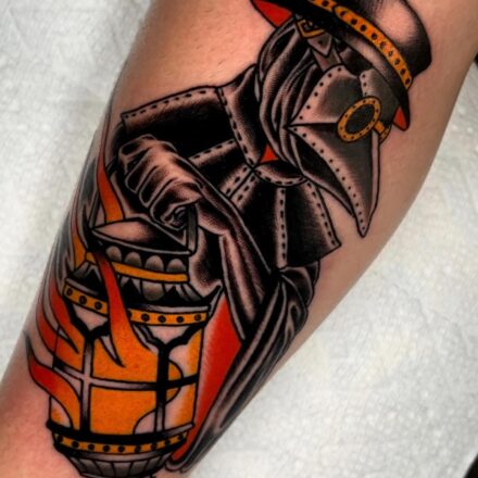 Tetování morový doktor a nápisy na zádech