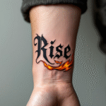 Tetování motivační slovo s plamenem na předloktí