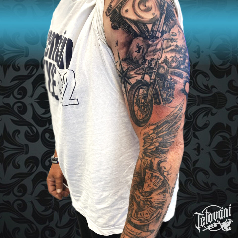 Tetování motorkáři, hodiny, křídlo, rukáv
