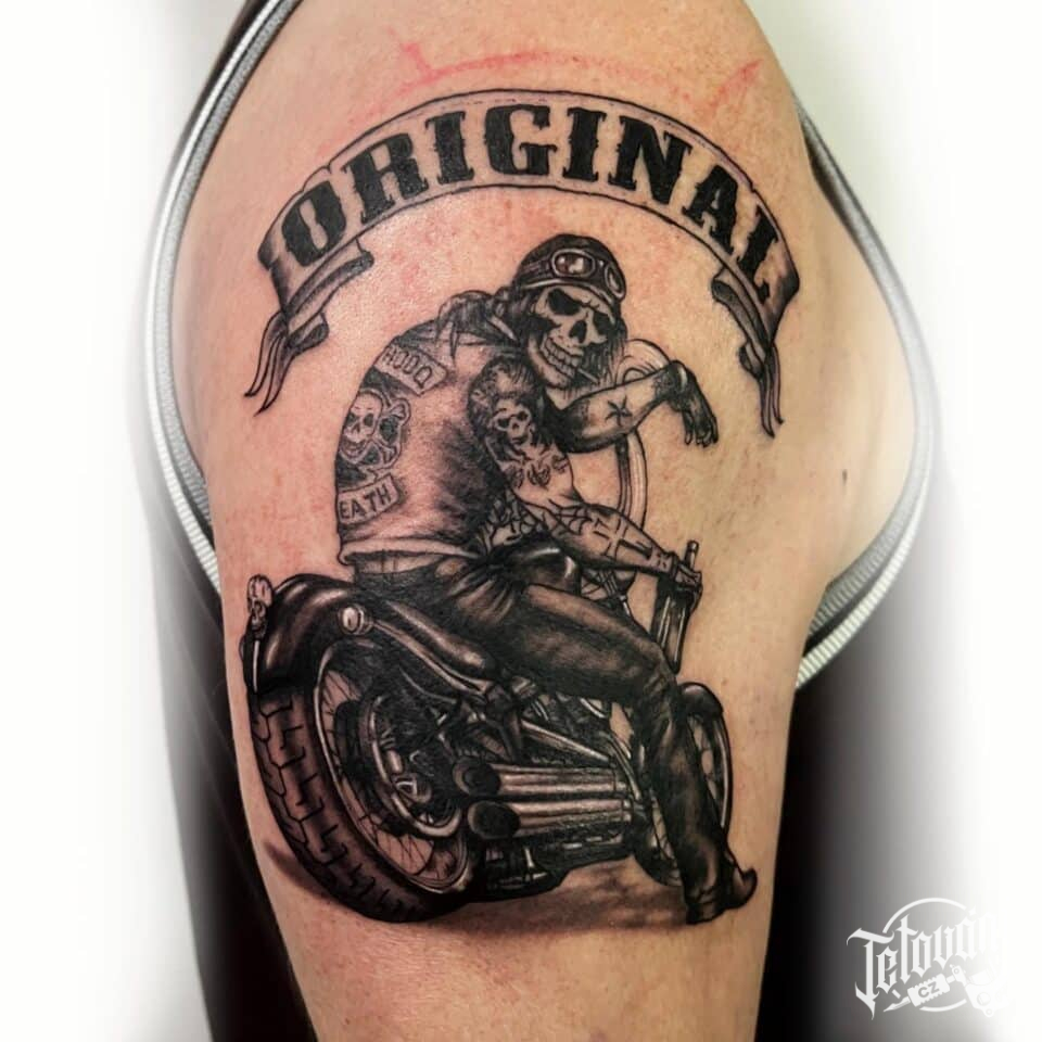 Tetování motorkáři, lebka, dopravní prostředek, nápis na rameno