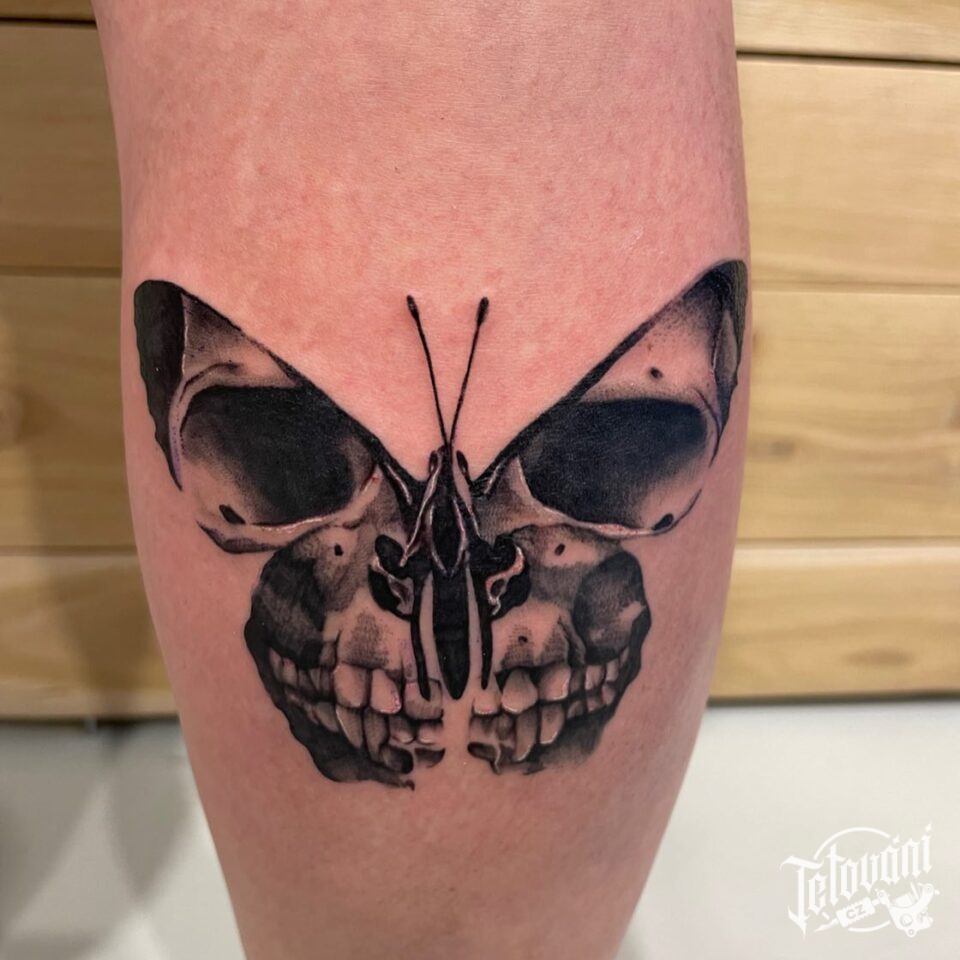 Tetování motýl a lebka na lýtku