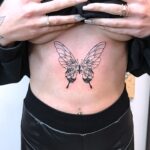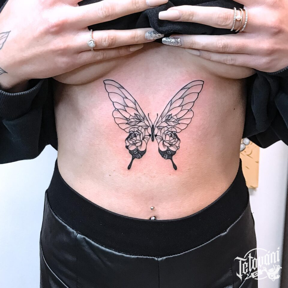 Tetování motýl a růže na břiše