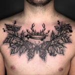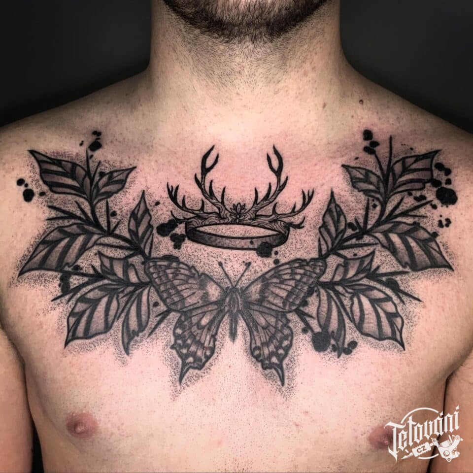 Tetování motýl, koruna na hrudi