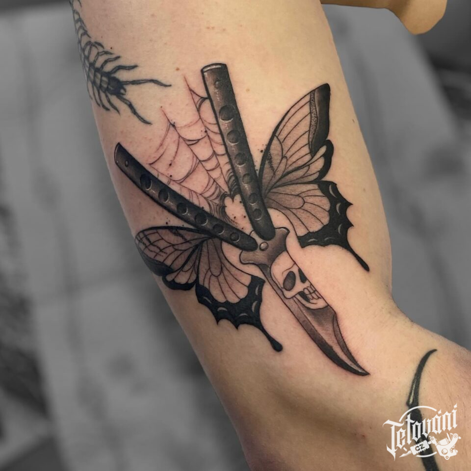 Tetování motýl, lebka, pavučina a znaky a symboly, symbol nůž na předloktí