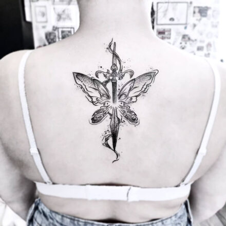 Tetování motýlí křídla a meč mezi prsa