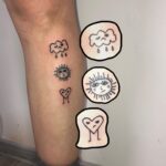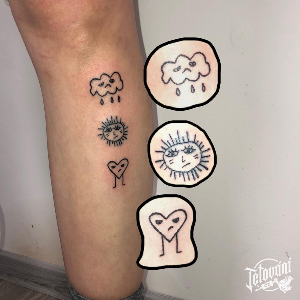 Tetování mráček, sluníčko a srdíčko na holeni