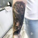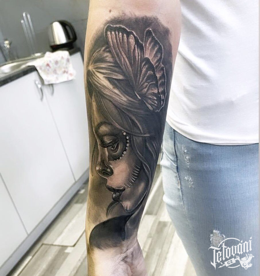 Tetování muerte portrét na předloktí