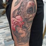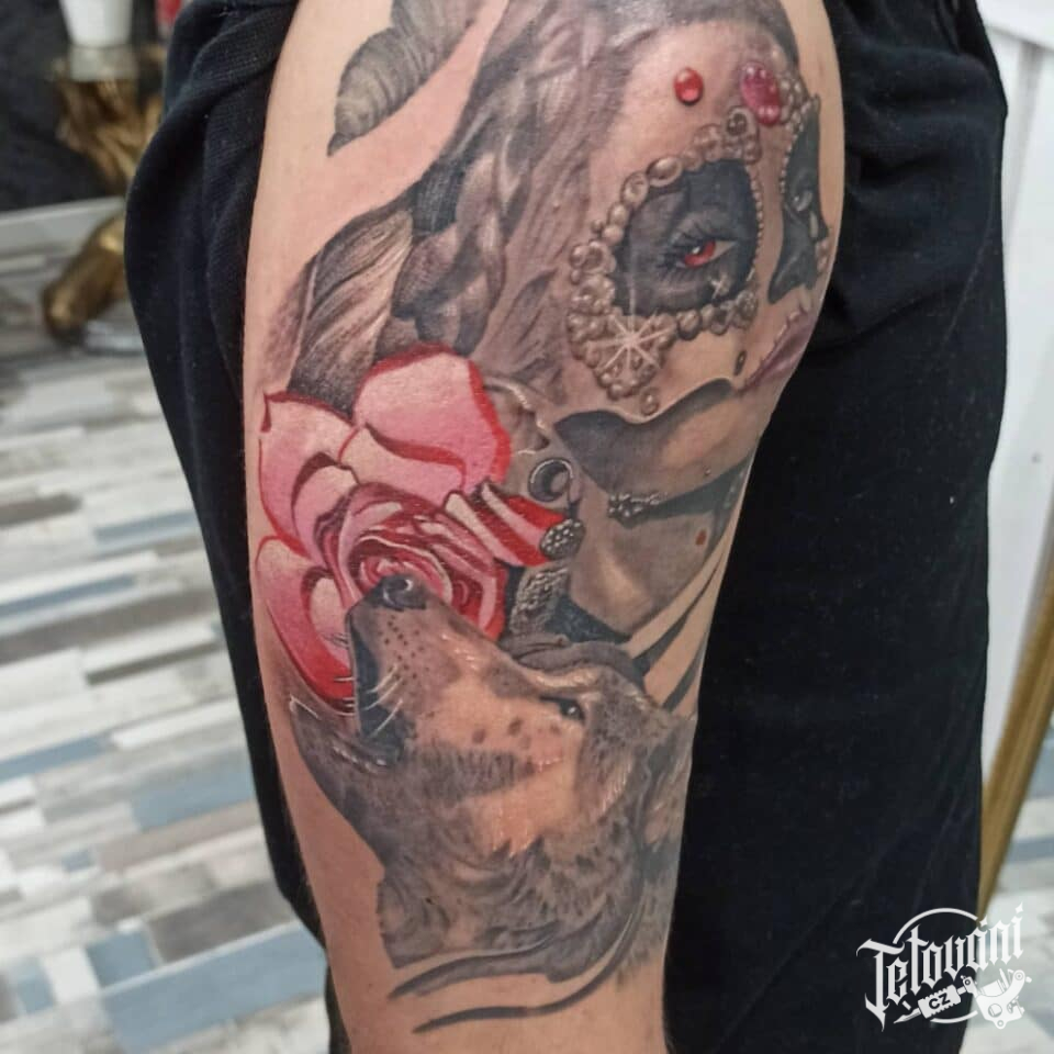 Tetování muerte žena, květiny, růže zvířata, pes na rameni