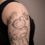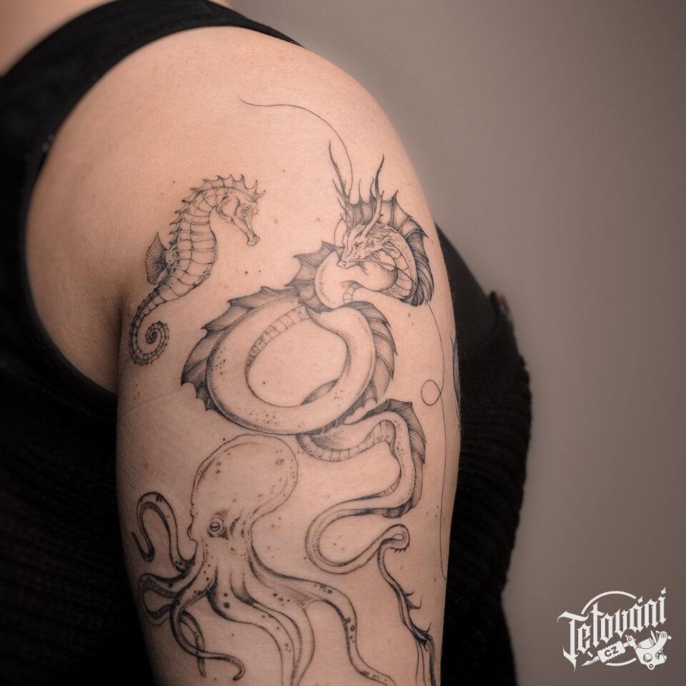 Tetování mýtická bytost a zvířata, drak, chobotnice, mořský koník na rameni