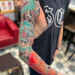 Tetování mýtická bytost a zvíře, drak a kapr, rukáv