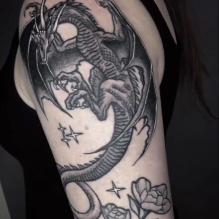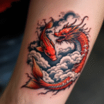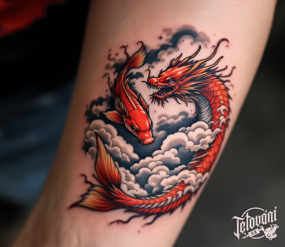 Tetování mýtická bytost a zvíře, drak a koi kapr na předloktí