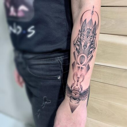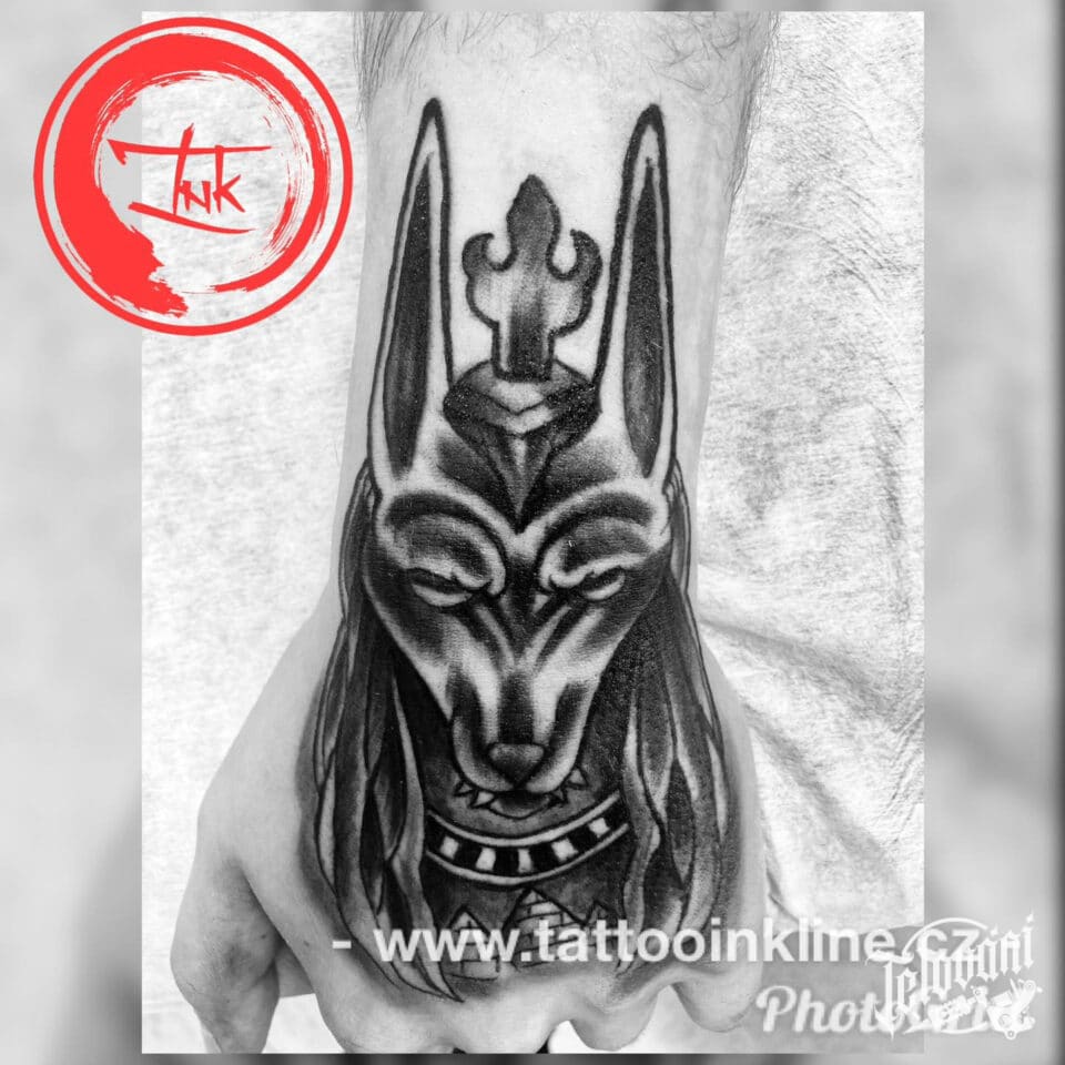 Tetování mýtická bytost, Anubis na hřbetu ruky