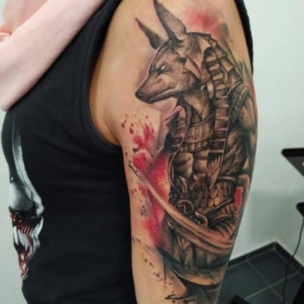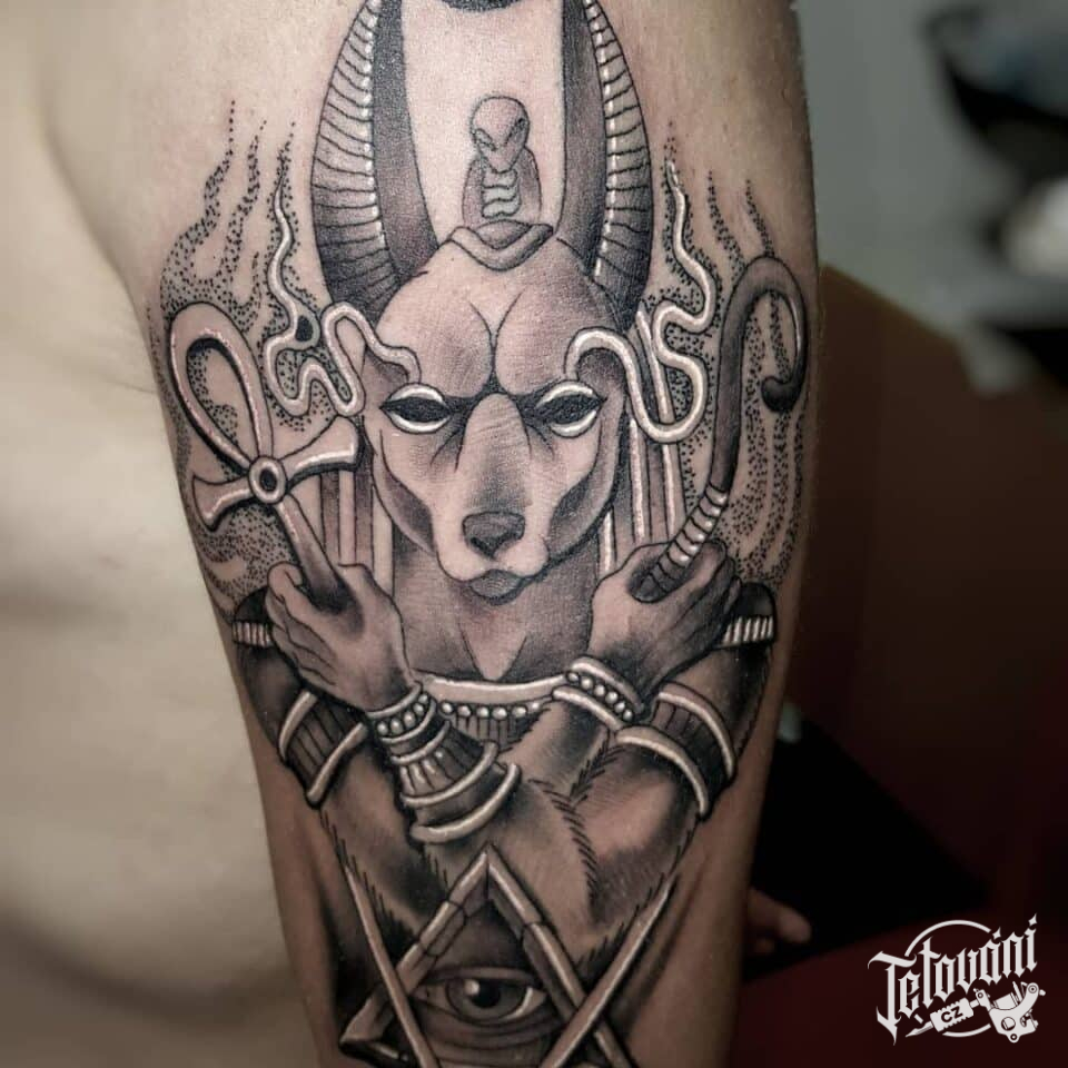 Tetování mýtická bytost Anubis na rameno